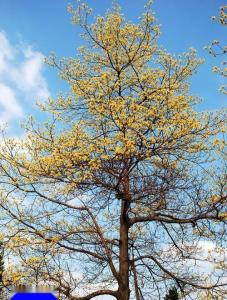 花小,黄色,杂性异株;短圆锥花序顶生,先叶开放;花被片6,披针形;能育雄蕊9,不育雄蕊3,花药4室,均内向瓣裂;雌蕊1。
