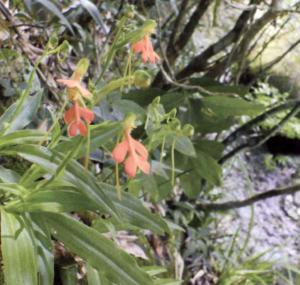 植株高8-35厘米。块茎长圆形,肉质,长2-3厘米,直径1-2厘米。茎粗壮,直立,圆柱形,下部具4-6枚叶,向上具1-3枚苞片状小叶。叶片线状披针形至近长圆形,长10-15厘米,宽1.5-2厘米,先端渐尖,基部抱茎。总状花序具2-10余朵疏生的花,长3-8厘米,花茎无毛;花苞片卵状披针形,长1.5-1.7厘米,先端渐尖,短于子房;子房圆柱形,扭转,无毛,连花梗长2-3厘米;花中等大,萼片和花瓣绿色,唇瓣橙黄色、橙红色或红色;中萼片直立,近圆形,凹陷,长约9毫米,宽约8毫米,先端钝,具3脉,与花瓣靠合呈兜状;侧萼片长圆形,长9-10毫米,宽约5毫米,反折,先端钝,具5脉;花瓣直立,匙状线形,长约8毫米,宽约2毫米,先端钝,具1脉;唇瓣向前伸展,轮廓卵形,长1.8-2厘米,最宽处约1.5厘米,4裂,基部具短爪,侧裂片长圆形,长约7毫米,宽约5毫米,先端钝,开展;中裂片2裂,裂片近半卵形,长约4毫米,宽约3毫米,先端为斜截形;距细圆筒状,污黄色,下垂,长2-3厘米,直径约1毫米,末端通常向上弯;蕊喙大,三角形,具延长的臂;柱头2个,隆起,棒状,稍弯曲,长约2.5毫米。蒴果纺锤形,长约1.5厘米,先端具喙,果梗长约5毫米。花期7-8月。果期10-11月。