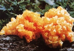 子实体由数枚中空泡状瓣片组成,直径约7cm,橙黄色。角质。气微,味淡。原形态子实体橙黄色,宽6-7cm,由中空的瓣片组成,子实层生于子实体表面。担子卵形,浅黄色,(14-16)μm×(10-12)μm,生于近子实层体的表面。孢子球形,具小尖,直径6-7μm。