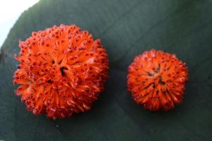 干燥果实呈卵圆形至宽卵形,顶端渐尖,长2~2.5毫米,直径1.5~2毫米。外表面黄红色至黄棕色,粗糙,具细皱纹。