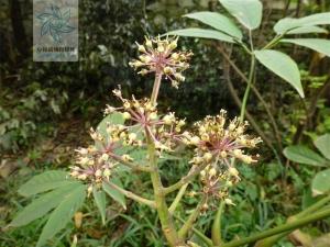 圆锥花序顶生,长不超过15厘米(稀长达30厘米),主轴和分枝有灰白色星状短柔毛,不久毛脱稀变几无毛;伞形花序单个顶生或数个总状排列在分枝上,有花约20朵;苞片早落;总花梗长1-2厘米,花梗长4-5毫米,均疏生灰白色星状短柔毛;小苞片线状 长圆形,长约3毫米,外面有毛,宿存;花白色;萼长2-2.5毫米,有灰白色星状短柔毛,边缘有5齿;花瓣5,长约3毫米,有羽状脉纹,外面有灰白色星状短柔毛,毛很快脱净;雄蕊5,略露出于花瓣之外;子房5室;花柱合生成柱状,长约1毫米,结实时长至2毫米以上;花盘略隆起。