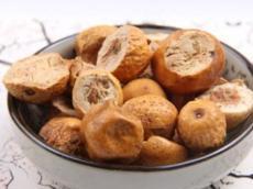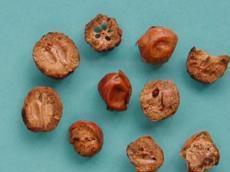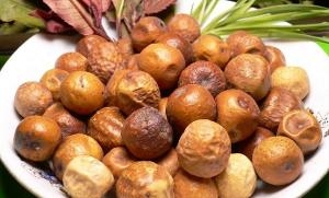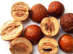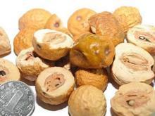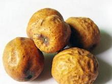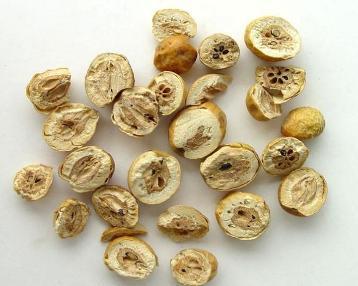核果呈类圆形,直径2-3.2cm。表面金黄色至棕黄色,微有光泽,皱缩,或略有凹陷,具深棕色小点。顶端有花柱残痕,基部凹陷,有果梗痕。外果皮革质,与果肉间常有空隙;果肉松软,淡黄色,遇水润湿显粘性。果核球形或卵圆形,质坚硬,两端平截,有6-8条纵校,内分6-8室,每室含黑棕色长圆形的种子1颗。气特异,味酸、苦。以个大、饱满、外皮金黄色、果肉黄白色者为佳。
