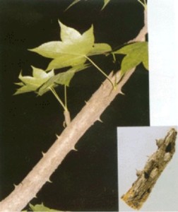 树皮板状或向内卷曲,厚2~7mm。外表面浅灰黑色,有灰白色斑纹,或灰绿色至黑褐色地衣附着,具纵皱纹及裂纹并有棕褐色菱形皮孔,钉刺乳头状,稍呈纵向扁长,顶端有锐刺或因除掉而留下的痕迹,钉刺基部直径0.5~1cm,较大的钉刺有的稍有环纹;内表面黄棕色,平滑,有细纵纹。质坚硬,断面纤维性。气微,味微辛、略麻舌。