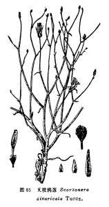 叉枝鸦葱在天然草场上多数植株具有轴根型的根系,一般主根强壮,近垂直于地面上,还可见到根蘖型的根系,由地下水平根上生长出稍粗的枝条,和较纤细的侧根。叉枝鸦葱为早生植物。喜砂质土及砂砾质基质。生长于干燥的砂质坡地、沙丘间低地、干河床边缘和浅洼地的砂壤土上。为荒漠草原植被的常见伴生种。它在群落中的多度很低,其分盖度不超过1%,但恒有度较高,分布于各种群落中,常与冷蒿(Artemisiafrigida)、沙生针茅(Stipaglareosa)、无芒隐子草(Cleitogenessongorica)、短花针茅(S.breviflora),阿尔泰狗娃花(Heteropappusaltaicus)、兔唇花(Lagochilusilicifolium)、戈壁天门冬(Asparagusgobicus)、碱韭(Aliiumpoiyrrhizum)等优势成分或伴生成分混生。此外,也可见于草原化荒漠群落及荒漠地带的干河床与沟谷中。在内蒙古6—7月开花,8—9月结果。