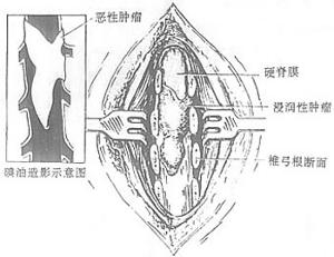 1.硬脊膜外肿瘤:此类肿瘤多属恶生,往往侵犯周边骨质,完全切除多有困难,故难以根治,可分块或大部分切除以达到减压的目的。已侵及椎体的肿瘤,手术进路最好经前路或侧前方进路,切除病变的椎体,缺损部份可用人工椎体或自体骨移植替代,后路椎板切除减压尽管可达到减压的目的,但加重了脊柱的不稳,故应辅以一些内固定器械稳定脊柱,如哈氏棒、卢氏棒以及弓螺钉和钢板等。以类肿瘤病程发展较快,一旦出现脊髓神经明显受损的征象,手术治疗的效果也较差。