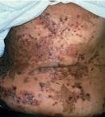 2.皮损初为大小不等多角形或不规则形淡红斑,偶见粟粒至绿豆大丘疹和丘疱疹,1~2天内变为暗紫红色,中心苍白或为紫癜样,随后中央出现浅表水疱或脓疱,易破裂形成糜烂和结痂脱屑遗留淡褐色至青铜色色素沉着。红斑边缘向周边扩展,境界清楚的红色结痂性边缘呈环状或多环状。从红斑到留有色素沉着经历7~14天,皮疹此起彼伏。损害可自行消退,间隔几周至几月后周期性发作。皱襞处糜烂口鼻周红斑结痂,指端呈红棕色斑伴脱屑。一些患者则为鳞屑性斑疹或丘疹类似湿疹样皮炎。