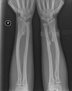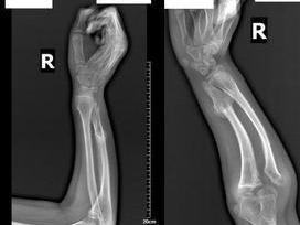 这种病的很大特点在于有骨形成的缺陷和骨骼畸形。特别是在髋部可呈双侧髋外翻及股骨近侧端变宽(图3)。腕关节出现逐渐的尺骨偏斜、尺骨相对短缩等。