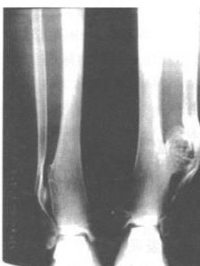 本病男性多于女性,约为3∶1,多见于儿童至20岁左右者。多数病人有阳性家族史,作者医院即有父亲及两个女儿同时住院手术的病例。一般临床表现多为可触及的骨性肿块。由于骨骼短缩及弯曲而造成骨骼畸形。关节附近的肿块常可造成关节活动受限。遗传性多发性骨软骨瘤的病变常成对称分布。病变的数量不一,多的有超过100个者。典型发病部位是股骨、胫骨、腓骨的远近侧端及肱骨近侧端(图1,2)。经验证明:如果在膝关节周围骨上没有外生骨疣,则遗传性多发性骨软骨瘤的诊断不能成立。位于桡、尺骨远侧部的发病稍少些。与单发性骨软骨瘤相比,遗传性多发性骨软骨瘤更倾向于在肩胛骨、髂骨、肋骨处发病。