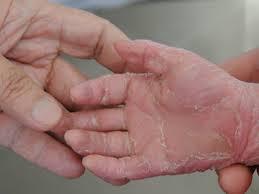 1.毛发红糠疹 皮损为特征性棕红或淡红色毛囊角化性丘疹分布范围较广,头面部可见干性鳞屑性皮损伴掌跖角化过度干燥及皲裂。进行缓慢范围较广,尤以手指背侧第1、2节特别显著,扪之有木锉样感。