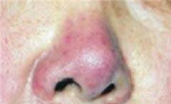 2.在鼻端、鼻翼部发生多数密集红色粒状丘疹及弥漫性潮红,表面无鳞屑,偶见有小疱及小脓疱。可有轻微的痒感,偶发生在颊、额部者。