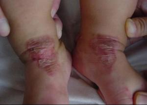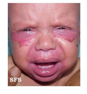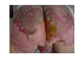 1.皮肤损害 原发疹为疱,疱液开始透明,以后由于继发感染而变混浊,皮损互相融合,形成大小不同的斑片,周围绕以红晕,对称性分布于皮肤粘膜开孔部及周围,其他常见部位为手足(特别是指甲周围)、皱襞部(颈前、大腿内侧等处)、肘、膝、头顶、眼、鼻等处,以后皮损结痂,患部干燥、潮红、剥脱,呈银屑病样外观,境界清楚。