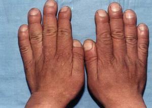 4.其他 部分患者尚有生长发育迟缓,智力低下,精神淡漠,鼻炎,口角炎,口腔炎,舌炎,结膜炎,睑缘炎,甲沟炎,指甲萎缩,以及抵抗力降低等,易继发全身或局部感染。