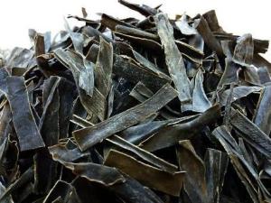 2、昆布:多年生大型褐藻。根状固着器由树枝状的又状假根组成,数轮重叠成圆锥状,直径5~15厘米。柄部圆柱状或略扁圆形,中实,长8~100厘米,直径10~15毫米,粘液腔道呈不规则的环状,散生在皮层中。叶状体扁平,革质,微皱缩,暗褐色,厚2~3毫米,1~2回羽状深裂,两侧裂片长舌状,基部楔形,叶缘一般有粗锯齿。孢子囊群在叶状体表面形成,9~11月产生游孢子。