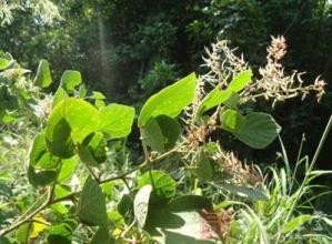 宽卵叶长柄山蚂蝗 小灌木,高约1m。茎纤细,有柔毛。叶柄长6-13cm,有毛;托叶狭三角形,先端尖;叶4-7丛生于茎中下部;三出复叶,顶生小叶宽卵形或卵形,长4.5-12cm,宽3-7.5cm,先端渐尖,基部圆形或宽楔形,两面有短柔毛,侧生小叶小,略斜。圆锥花序腋生,长达90cm,有疏长柔毛;苞片披针形;花梗长约3mm,结果时增长;花萼宽钟状,萼齿宽三角形,有疏毛;花冠粉红色,长约5mm;雄蕊10,单体。荚果长达2cm,荚节1-2,半三角状倒卵形,有密生的钩状毛。花期7-8月,果期9-11月。