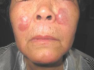 皮疹常突然出现,为多发性,可在数天到数周内向周围扩展增大,常融合成片。皮肤损害可为丘疹、结节、斑块、小脓疱、小水疱或紫癜样皮损等。典型的皮损为黄豆至掌心大,为浅红色至暗红色或棕红色环状隆起的斑块或结节,边缘清楚,呈圆形或椭圆形,局部有疼痛和触痛,常位于手臂和面、颊部,呈两侧性分布,但不对称。一般都有局部发硬和发热,皮损表面多不光滑,中央呈红色或表现正常。较晚期可有鳞屑及色素沉着,周边有高起、坚硬的绿豆大似水疱状丘疹群聚,即所谓假水疱,外观呈半透明样,大多不破溃,很少形成溃疡。个别病例可出现大疱或继发感染,常发生湿疹样改变和结痂。