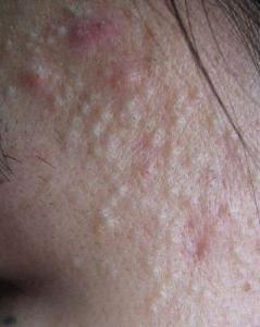 皮损好发于面部及上胸背部。痤疮的非炎症性皮损表现为开放性和闭合性粉刺。闭合性粉刺(又称白头)的典型皮损是约1毫米大小的肤色丘疹,无明显毛囊开口。开放性粉刺(又称黑头)表现为圆顶状丘疹伴显著扩张的毛囊开口。粉刺进一步发展会演变成各种炎症性皮损,表现为炎性丘疹、脓疱、结节和囊肿。炎性丘疹呈红色,直径1~5毫米不等;脓疱大小一致,其中充满了白色脓液;结节直径大于5毫米,触之有硬结和疼痛感;囊肿的位置更深,充满了脓液和血液的混合物。这些皮损还可融合形成大的炎性斑块和窦道等。炎症性皮损消退后常常遗留色素沉着、持久性红斑、凹陷性或肥厚性瘢痕。临床上根据痤疮皮损性质和严重程度将痤疮分为3度、4级:1级(轻度):仅有粉刺;2级(中度):除粉刺外,还有一些炎性丘疹;3级(中度):除粉刺外,还有较多的炎性丘疹或脓疱;4级(重度):除有粉刺、炎性丘疹及脓疱外,还有结节、囊肿或瘢痕。
