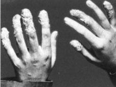 受累部位除手足外,黏膜特别是口腔黏膜也可波及。形成痛性环形白斑,假膜形成和皲裂。甲常受累引起甲沟炎,随疾病进展,甲板可营养不良或脱屑。皮肤损害可导致皮肤萎缩及其下方软组织的硬化,以至于整个骨组织和指头的吸收。