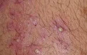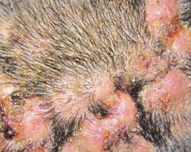 初发为局限于头皮的深部毛囊炎,继发毛囊周围炎,逐渐形成相互贯通深部脓腔,表面呈蚕豆至胡桃大小脓肿,压迫表面可自多数毛孔中渗出脓液(筛状溢脓)。好发于中年男性病情顽固,经过缓慢倾向复发。病损部毛发稀少,治愈后遗留萎缩性瘢痕和不规则脱色斑。
