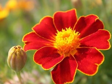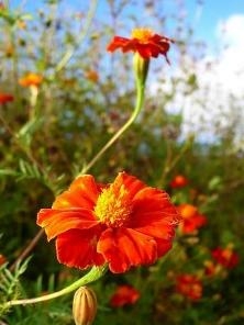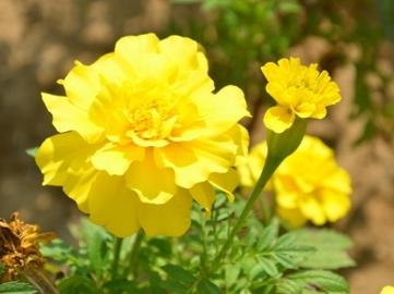 寓有吉祥之意的万寿菊——孔雀草,早就被人们视为敬老之花。至于“万寿菊”之芳名的由来, 还有一个有趣的故事呢! 传说十六世纪中叶,此花从国外传到中国南方,人们不知其芳名,只见它每年从秋到冬开花,呈瓣形,似菊,且花色美丽,因其花叶又有一股臭味,故称其为“瓣臭菊”。一年秋天,有位县太爷做大寿,管家为增添气氛,在大门口摆上两列盆花,顿时黄绿交辉,耀眼异常。县太爷见之大喜,问道:“这叫什么花?”管家笑答:“瓣臭菊。”谁料县太爷误听了,眉飞色舞地称赞道:“啊!万寿菊,好呀!好呀!”从此,万寿菊之芳名便不胫而走,广为流传。万寿菊叶绿花艳,人们喜欢用它绿化、美化环境。逢年过节,特别是老年人寿辰,人们往往都以万寿菊作礼品馈赠,以示健康长寿。