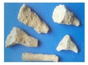 【原形态】晶体结构属三方晶系。呈扁圆锥形、圆锥形及圆柱形。表面粗糙,凹凸不平。类白色,有的因含杂质而染成灰白色或浅棕黄白色等。玻璃光泽或暗淡。硬度3,性脆。断面较平整,可见同心层状构造成放射状构造,中心有的有空心。相对密度2.6-2.8。