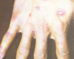 由溶血性链球菌或与金黄色葡萄球菌混合感染所引起的主要表现为脓痂性脓疱病。多发于颜面、口角、口唇、鼻孔、耳部及四肢等暴露部位,在红斑的基础上出现壁薄的水疱,然后迅速发展成脓疱,在脓疱周围有红晕,脓疱破后,脓液干燥,形成蜜黄色厚痂。周围不断有新疹出现,自觉瘙痒,常因搔抓而播散到身体其他部位。少数患者鼻腔、口腔及舌粘膜亦可受累。重者可伴发淋巴结炎、疖病、丹毒或淋巴管炎等;可有发热、畏寒等全身症状,也可诱发急性肾炎,极少数体弱儿童或新生儿患者可引起败血症导致死亡。