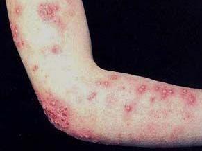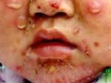 传染性脓疱病流行于夏秋季,多半发生于儿童,传染性很强,在家庭之中很容易相互传染,多见于暴露部位。由于感染球菌不同,临床表现也不一样,由金黄色葡萄球菌感染者,主要表现为大疱型脓疱疮。初为散在的鲜红色丘疹或水疱,以后水疱迅速扩展增大、至蚕豆大或更大,疱内液体开始清亮以后混浊变成脓汁形成脓疱,周围有红晕,有时脓疮上部分疱液清澈,下部分因混浊的黄色脓液沉积于疱底部而呈半月形,形成本病的特征,泡壁很薄、松弛易破,破后形成糜烂面,干燥后形成黄色脓痂,有时痂下脓液向周围溢出,在原皮损的周围形成新的脓疱,有的排列成环状或链状,称为环状脓疱病,好发于面部、四肢等暴露部位,自觉瘙痒,一般无全身症状。