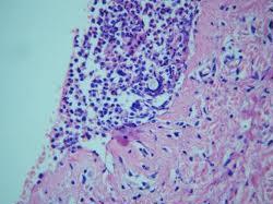 2.取新出水疱作组织病理检查示表皮下疱,疱内及疱下有嗜酸性粒细胞浸润。