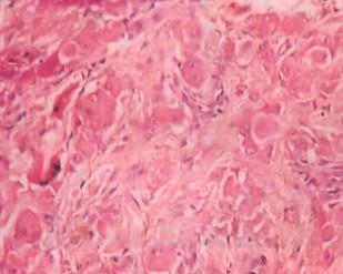 本病的发病机制还不很清楚。本病是一种肉芽肿病变,主要累及皮肤和关节。在本病的组织细胞和巨细胞中,可见脂质沉着,少数病例可见黄色瘤皮疹,血胆固醇可轻度或暂时性升高,故有人认为本病是一种特殊的脂质代谢异常。由于这些改变并不具有普遍性,且血清和细胞内脂质常不一致,因而有人否定这种看法,认为吞噬脂质只是一种继发现象。电子显微镜下发现多数组织细胞质中有大量密集的类似溶酶体的小体,这些小体对酸性磷酸酶、溶酶、萘丁酸酶呈强阳性反应,可能是能产生多种酶的物质。实验表明人工激活的组织细胞也含有大量的溶酶体,其释放的蛋白酶和水解酶可导致类似于本病的组织破坏和炎症反应。电镜还显示,细胞内含有完整的或退化的胶原纤维,但为非特异性改变。因而有人认为本病可能在某些未知因子的作用下,诱导单核细胞或巨细胞,滑膜中滑膜细胞(A型、B型)衍变为组织增生细胞。形成肉芽肿改变。病理:本病具有以下组织病理特征:①病灶处见有大量多核巨细胞;②纤维组织增生;③脂质沉着;④大量嗜酸性毛玻璃样组织细胞。典型改变以肌肉和淋巴表现最为明显。