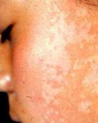 ⒋色素减退性圆形或椭圆性斑片,大小不等,直径1cm至数cm,淡白色或淡红色,边界清楚,上覆少量的鳞屑