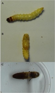 成虫暗褐色,体狭长略扁。 前胸和中胸能有力地活动。当虫体被压住时,头和前胸能作叩头状活动,所以叫叩头虫。